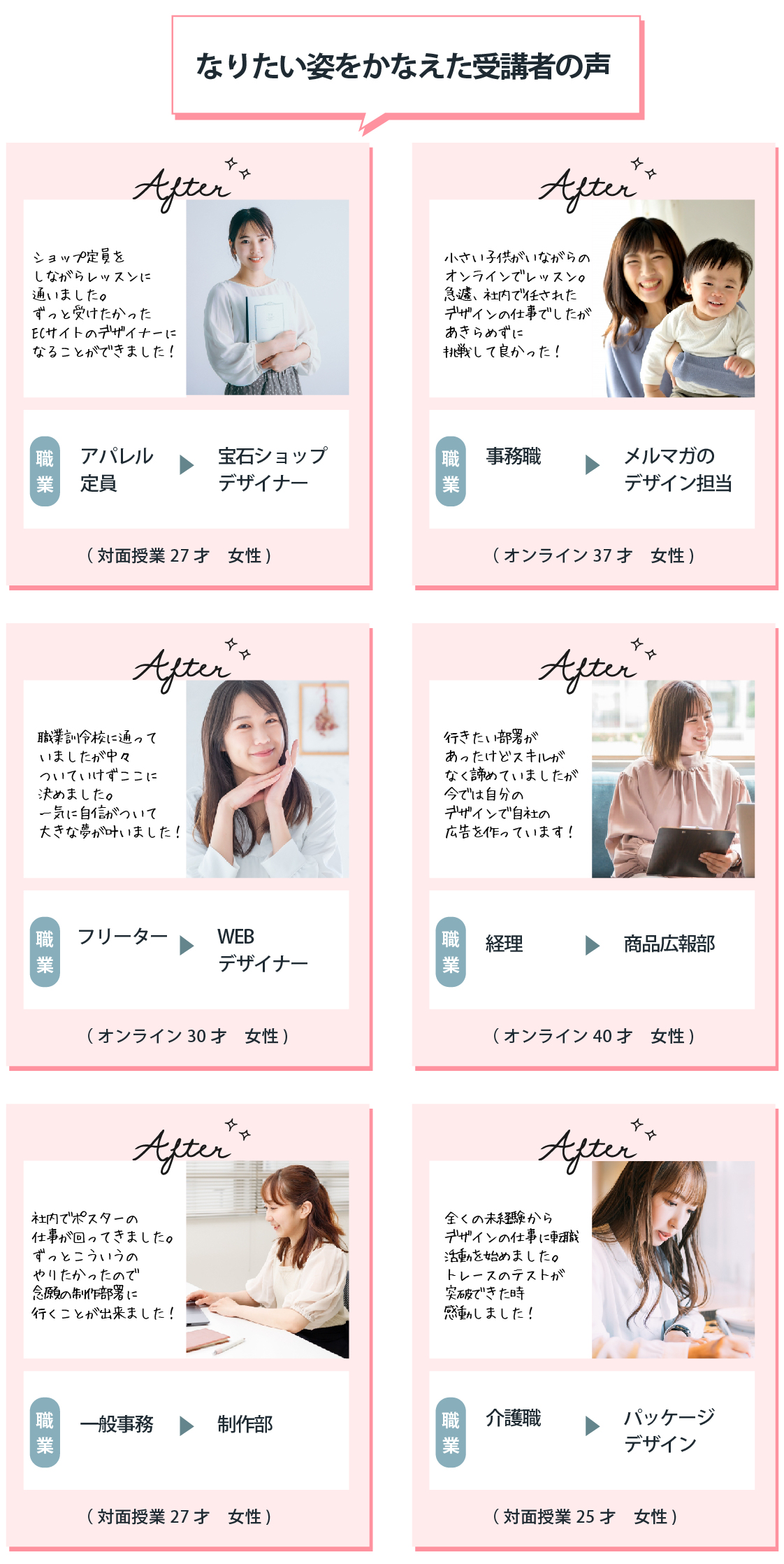 最初はなんとなく初めてみたレッスン先生にやりたいことは何?と質問される度、自分は何をしたいんだろう?とレッスンが終わる度、正直悩んでしまった時期があります。それでも先生はやさしく根気強く、「どうなりたいか」という質問を私に繰り返しました。自問自答を繰り返したおかげか、自分の中のライフスタイルが明確になっていきました。今では、行きたい企業も決まり、第一志望に通過した際は、真っ先に先生に連絡。第二次試験に向けて先生とトレースの猛特訓中です頑張ります!