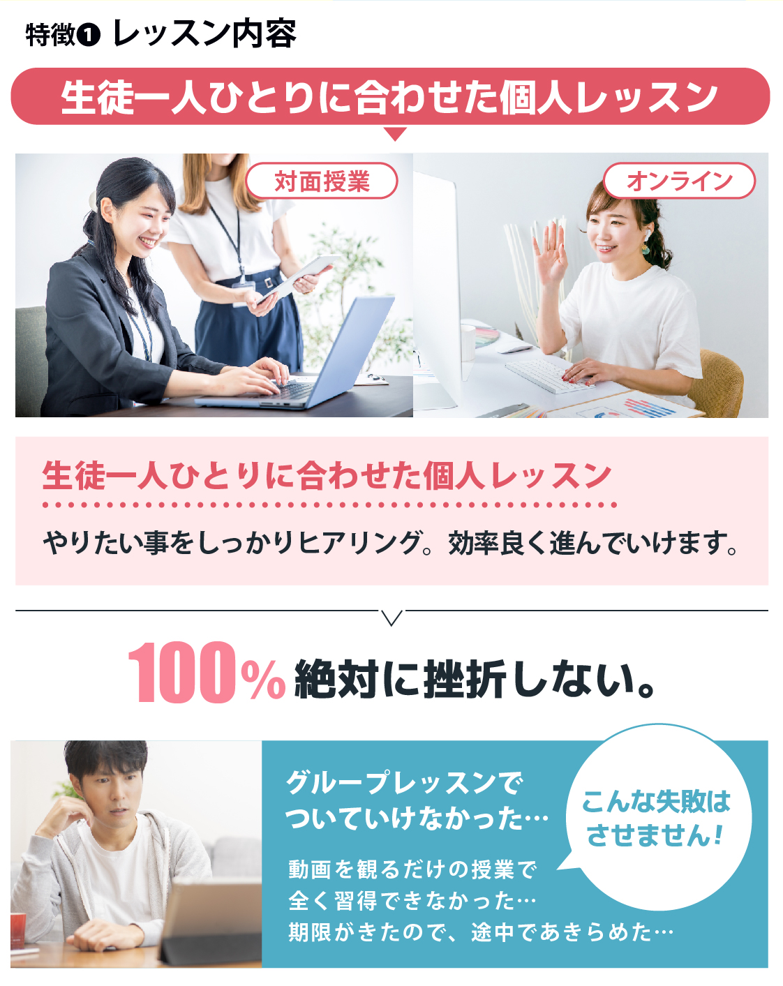 ハローワークの職業訓練校に行こうとしていたころ先生に出会いました。訓練校に行くことは賛成してくれましたが物足りなさや大勢でのレッスンという点での訓練校のデメリットも教えてくださいました。先生の個人レッスンに決めレッスンをスタートしてからも最初はソフトの難しさにいつも泣いていました。とにかく私は、なにもかもが不安で、さっき自分の決めた事にもすぐ不安になる癖がありました。同時に先生には知識以外に自信をつけること。を教わったような気がします。ソフトも思い切ってレッスン以外の日に猛復習してみました。その日から変われたような気がします。ぐんぐんと力がつく感覚があり勉強が楽しくなりました。